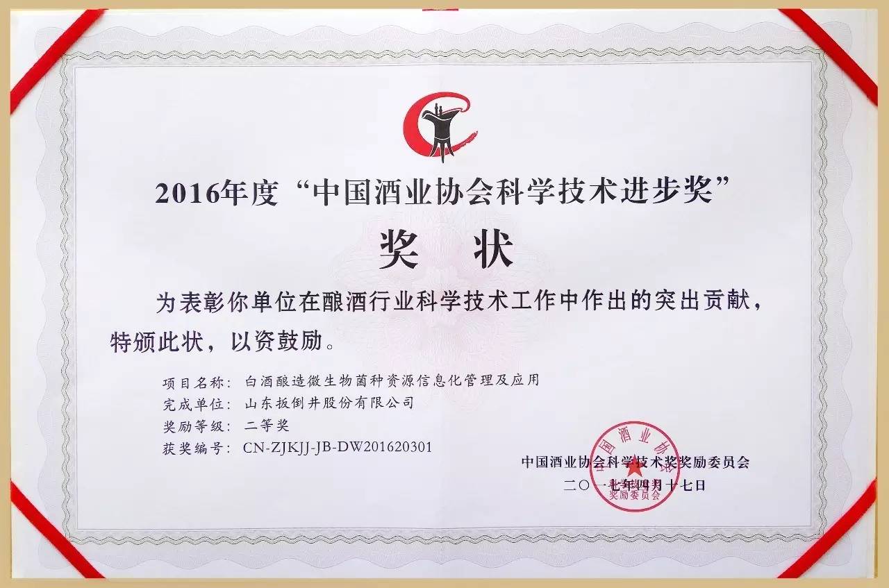 4月17日,2016年度“中國酒業(yè)科學(xué)技術(shù)獎”揭曉,國井扳倒井“白酒釀造微生物菌種資源信息化管理及應(yīng)用”項(xiàng)目,獲中國酒業(yè)協(xié)會科學(xué)技術(shù)進(jìn)步獎二等獎,是山東白酒行業(yè)所獲最高獎。