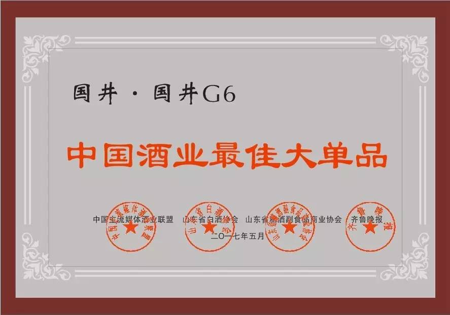 5月24日,由中國(guó)酒業(yè)協(xié)會(huì)、中國(guó)酒類流通協(xié)會(huì)指導(dǎo),中國(guó)主流媒體酒業(yè)聯(lián)盟、山東省白酒協(xié)會(huì)、山東省糖酒副食品商業(yè)協(xié)會(huì)、齊魯晚報(bào)等主辦的2017“中國(guó)酒業(yè)最佳大單品”評(píng)選揭曉,國(guó)井G6榮獲“中國(guó)酒業(yè)最佳大單品”稱號(hào)。
